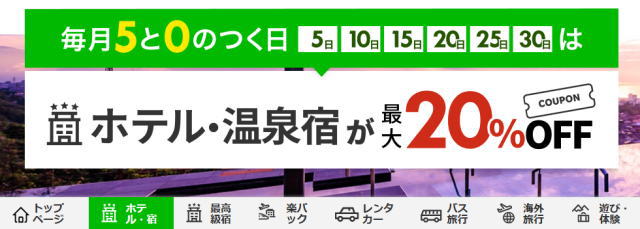 さらに!毎月5と0のつく日には、ホテルや温泉宿が最大20%OFFとなるクーポンを提供しており、他にも定期的にお得なキャンペーンを開催中!